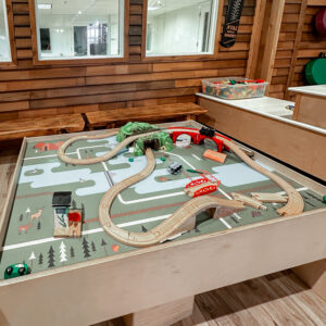 All aboard! Our wooden train table, featuring a custom map of Kamloops, invites kids to explore and play as they guide trains through our city’s landmarks.